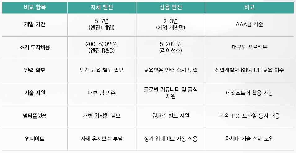 엔진 표준화 흐름 속에서 국내 개발사들의 전략도 변화하고 있다. 한국은 과거 PC MMORPG 전성기 시절 일부 대형사가 자체 엔진을 보유하기도 했으나, 현재는 대부분의 개발사가 외산 엔진에 거의 전적으로 의존하는 구조가 되었다. 엔씨소프트, 넥슨, 넷마블, 크래프톤 등 주요 기업들도 언리얼 엔진 또는 유니티 엔진을 핵심 파이프라인에 채택하고 있으며, 최근 신작들은 거의 예외 없이 이들 상용 엔진으로 개발되고 있다. 일례로 엔씨소프트는 한때 <리니지 이터널>을 위해 자체 엔진을 개발했으나 완성도 문제로 프로젝트가 장기 표류했고, 결국 해당 프로젝트를 언리얼 엔진 기반의 <쓰론 앤 리버티>로 방향 선회하였다.