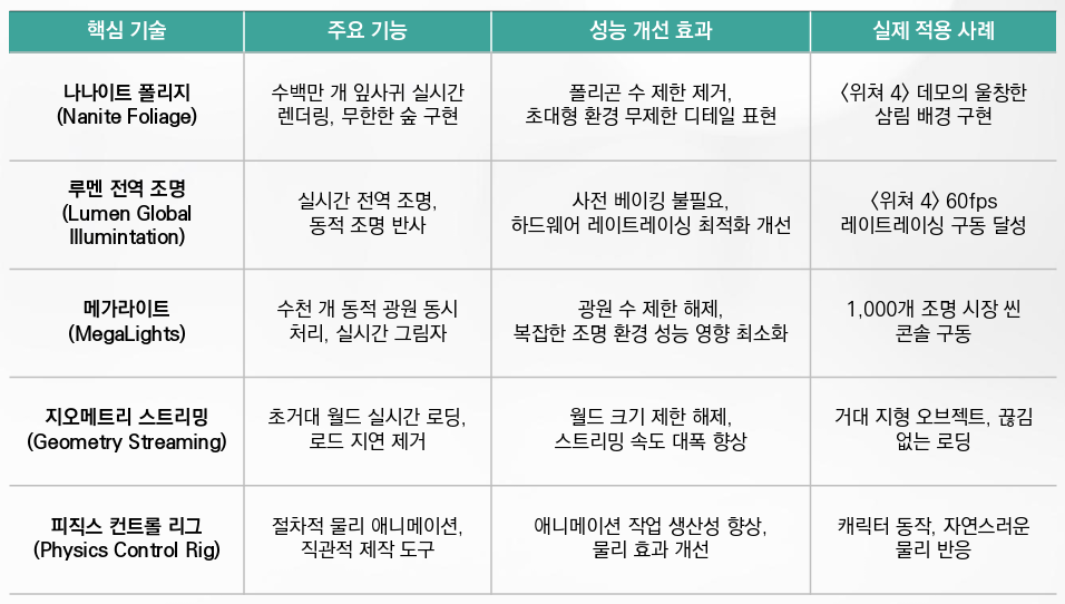 <표> UE5 핵심 기술별 성능 향상 및 적용 효과