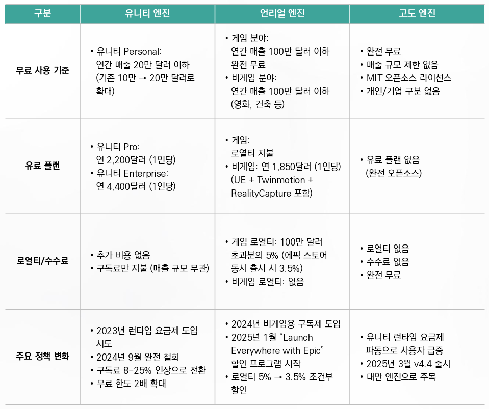 <표> 주요 게임 엔진별 라이선스 비용 및 정책 비교 (2025년 기준)