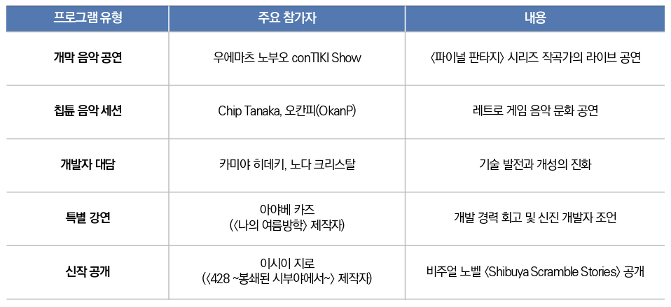 저명 개발자들의 적극적 참여도 비트서밋의 국제적 위상을 높이는 데 기여했다. <파이널 판타지> 시리즈의 작곡가 우에마츠 노부오가 자신의 밴드와 함께 개막 공연을 장식했고, <게임보이 카메라>의 개발자이자 칩튠 음악의 선구자인 Chip Tanaka, 인기 인디 작곡가 오칸피(OkanP) 등이 합류한 라이브 음악 공연이 열렸다. 또한 카미야 히데키(전 플래티넘게임즈 디렉터, <베요네타> 시리즈 감독)는 인디 개발자인 노다 크리스탈과 함께 게임 개발에서 기술 발전과 개성의 진화를 주제로 대담을 나누었고, 아야베 카즈(<나의 여름방학> 시리즈 제작자)는 오랜만의 공개 강연을 통해 젊은 인디 개발자들에게 조언을 전했다. 이러한 멘토링과 지식 공유 프로그램은 단순한 게임 전시회를 넘어 교육과 성장의 장으로서 비트서밋의 가치를 확장시켰다.