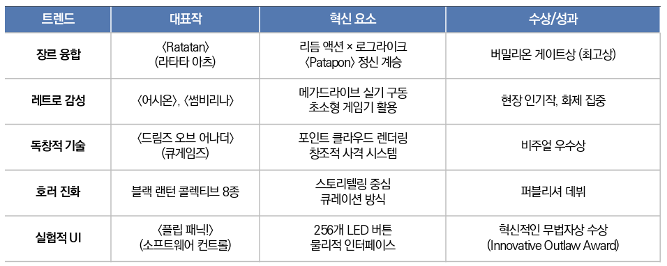 비트서밋 2025에서 확인된 가장 주목할만한 트렌드는 복합 장르 융합과 과거 IP의 인디 부활이었다. 올해 최고상인 버밀리온 게이트상(Vermilion Gate Award)을 수상한 <라타탄(Ratatan)>은 리듬 액션과 로그라이크 요소를 결합하여 과거 <파타폰(Patapon)> 시리즈의 정신을 계승한 크라우드펀딩 프로젝트로, 박자에 맞춘 유닛 지휘와 반복 도전 구조를 통해 완성도 높은 게임플레이를 구현했다. 또한 레트로 감성 부활도 두드러졌는데, 세가 메가드라이브용 신작 슈팅 게임 <어시온(Earthion)>이 현장에서 실제 메가드라이브 콘솔로 시연되어 관람객들이 복고 열풍을 직접 체감할 수 있었다. 손바닥 크기의 초소형 게임기 썸비(Thumby)로 즐기는 <썸비리나(Thumbylina)>와 같은 하드웨어 실험작도 아날로그 감성과 첨단 기술의 창의적 융합을 보여주었다.
