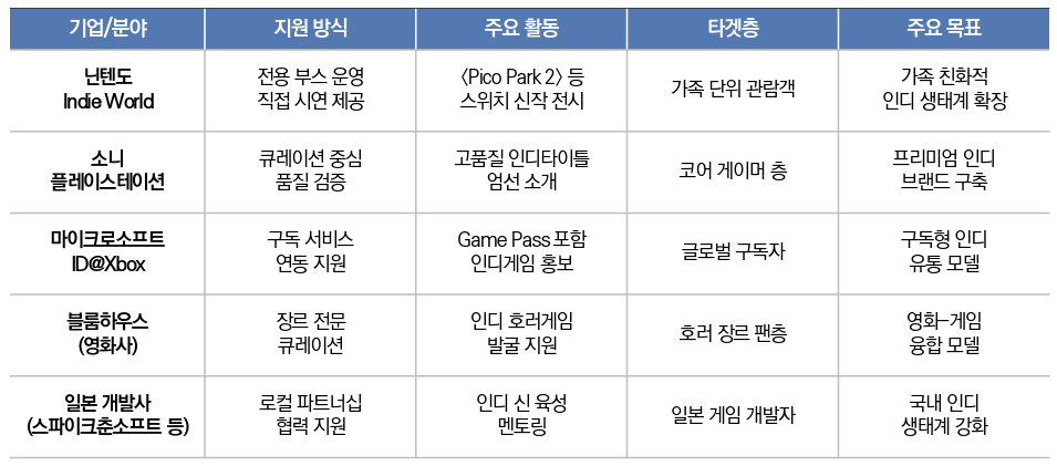 <표> 메이저 기업별 인디게임 지원 전략과 생태계 역할
