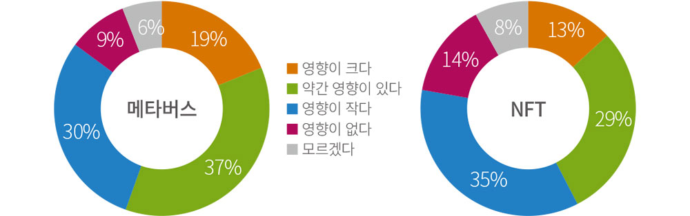 그런데 게임업계에서는 메타버스를 다른 분야보다 익숙하게 받아들이는 모양새다. 소프트웨어 개발사 퍼포스(Perforce)가 게임 개발자 300명을 대상으로 한 조사에 따르면 49%는 NFT가 게임에 미치는 영향은 미미하거나 아예 없을 것이라고 응답했다.1 반면 메타버스에 관해서는 56%가 실제로 파급력 있는 기술이라고 확신한다고 응답했다. 부정적응답은 39%로 NFT 대비 10%p 적었다. 퍼포스는 게임 개발자들이 메타버스에 대해서 NFT 대비 덜 적대적인 태도를 보이는 이유로 “몰입적이고 재미있는 경험”을 추구하는 게임과 메타버스의 지향이 부합하기 때문이라고 분석했다.2