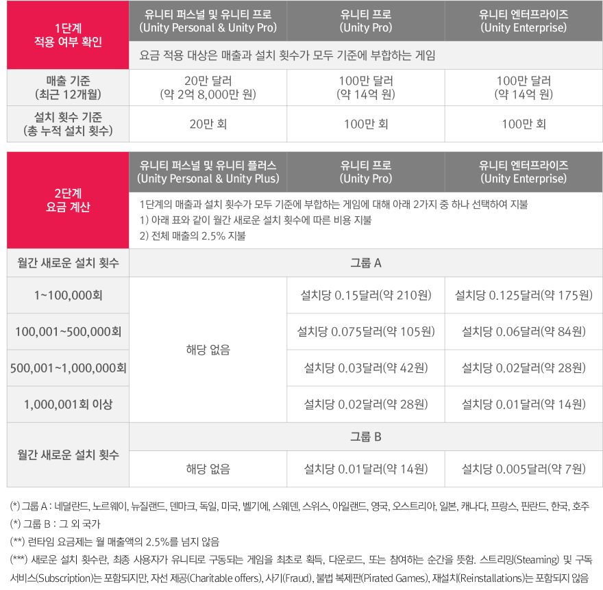 2023년 9월 23일 발표한 유니티의 런타임 요금제 개편안 출처 : Unity(2023.09) 유니티의 새로운 런타임 요금제 계산기: 유니티 프로 기준 출처 : Unity새로운 요금제에 따르면, 유니티 프로를 사용하는 개발사의 게임이 월 매출이 20만 달러(약 2억 8,000만 원)이고 월간 신규 다운로드 수가 6만 건인 경우 엔진 요금은 월 매출의 2.50%인 5,000달러(약 700만 원)이다. 위 사례의 경우 월간 신규 다운로드 수에 비례한 9,000달러(약 1,260만 원)보다 월 매출의 2.5%가 더 저렴하여 자동으로 계산된 것이다.