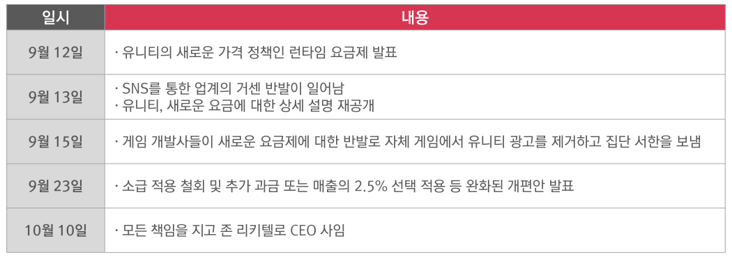 유니티는 새로운 설치 횟수18)에만 요금을 부과하며, 스트리밍과 구독 서비스는 포함되지만 자선 제공(Charitable offers), 사기(Fraud), 불법 복제판(Pirated Games), 재설치(Reinstallations) 등으로 인한 다운로드는 포함되지 않는다고 해명했다. 그러나 유니티가 이러한 사례들을 정확히 측정하거나 방지할 수 있는 기술을 확보하고 있지 않아 런타임 요금제 발표 후폭풍은 거셌다. 유니티를 사용하던 많은 개발사가 고객 입장을 고려하지 않은 요금제 발표에 실망감을 표하며 이탈을 선언하기도 했다. 유니티 사무실에 대한 살해 협박까지 이어지며 결국 10년간 회사를 이끌었던 존 리키텔리(John Riccitiello) CEO가 모든 책임을 지고 10월 10일에 사임했다.