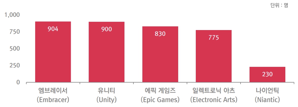 2023년 가장 많이 감원한 상위 5개 게임 개발사 출처 : Video Game Layoffs유럽 최대 규모 퍼블리셔인 스웨덴의 엠브레이서 그룹은 그룹사 전체에 대한 대규모 구조조정을 진행했으며, 이 과정에서 <세인츠 로우(Saints Row)> 시리즈로 유명한 볼리션(Volition)이 30년 만에 폐업했다. 유니티는 2022년 5월 전 세계 지사를 절반으로 줄이겠다 발표하며 인원 감축에 착수했으며 약 900명을 해고한 것으로 알려졌다. 또한, 2024년 1분기까지 자사 전략에 따른 특정 제품 서비스 중단 및 구조조정을 계획하고 있다고 밝혔다. 에픽 게임즈는 경영 악화로 2023년 9월 전체 직원의 16%에 해당하는 830명을 정리해고했다.