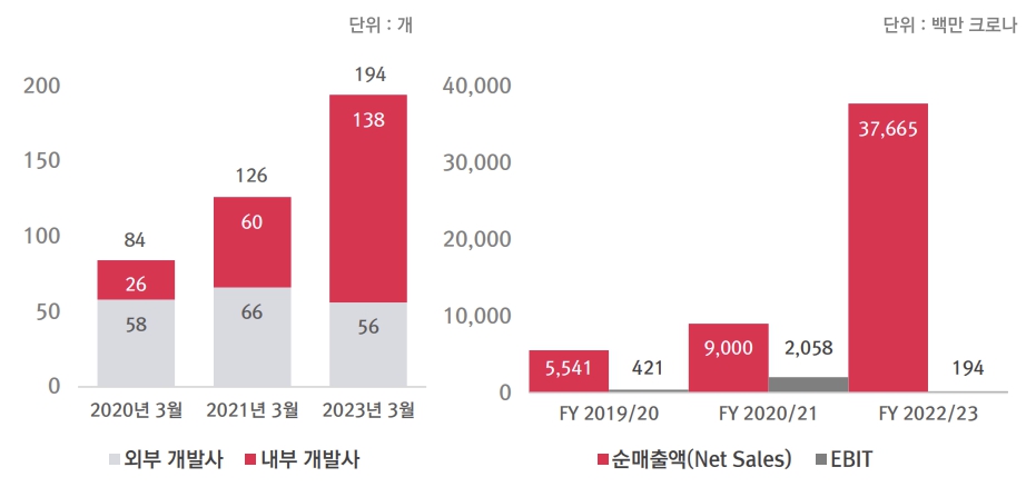2020~2023년 엠브레이서 그룹 산하 게임 개발사 수(좌)와 2019/20~2022/23 회계연도 순매출액 및 EBIT(우) 출처 : Embracer(2023.05)사업 확장에 힘입어 엠브레이서 그룹의 순매출액(Net Sales)은 2019/20 회계연도 55억 4,100만 크로나(약 6,631억 원)에서 2022/23 회계연도 376억 6,500만 크로나(약 4조 5,079억 원)로 6.8배 가량 증가했다. 하지만, 엄청난 외형적인 확장에도 불구하고 영업비용과 영업외비용이 모두 증가하며 동기간 EBIT21)는 4억 2,100만 크로나(약 503억 원)에서 1억 9,400만 크로나(약 232억 원)로 감소했다.