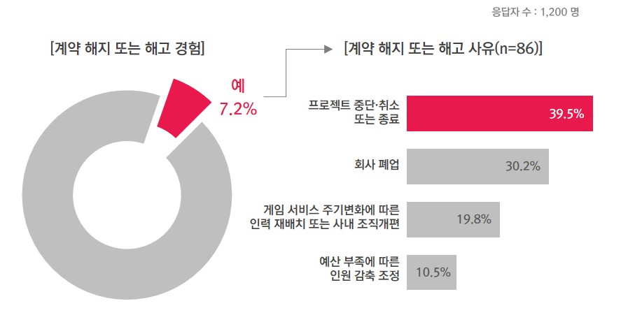 한국콘텐츠진흥원의 2022년 게임산업 종사자 노동환경 실태조사에 따르면, 설문에 참여한 1,200명 중 7.2%(86명)가 계약 해지 또는 해고 경험이 있다고 답했다. 이 중 '프로젝트 중단·취소 또는 종료'가 계약 해지 또는 해고 사유 중 39.5%로 가장 높은 비율을 차지했으며, 2022년에는 계약 해지 또는 해고 경험이 이전보다 크게 증가한 것으로 나타났다.