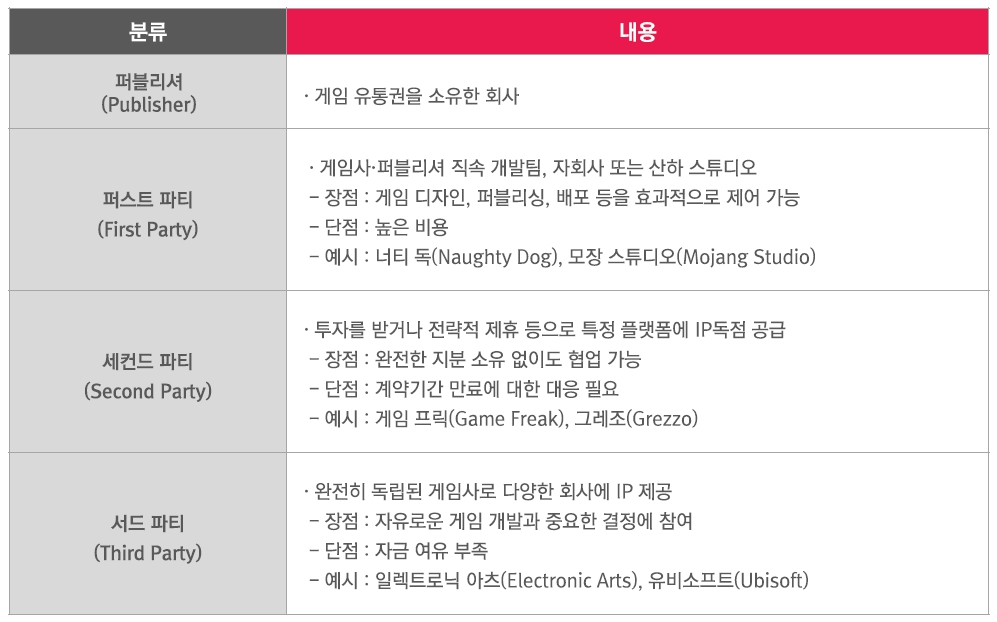 게임 개발사와 유통사 분류 및 상세 내용 출처 : 매일경제(2023.10), Make use of(2021.06) 내용 재구성국내 최대 개발사 중 하나인 스마일게이트(Smilegate)는 해외 IP 발굴과 투자에 지속적으로 주력하고 있다. 2022년 3월에는 북미 시장 확대를 목표로 신생 게임 개발사인 포스트카드 게임 스튜디오(Postcard Game Studio)에 350만 달러(약 49억 원)를 투자했다. 포스트카드 게임 스튜디오는 너티 독(Naughty Dog), 마이크로소프트(Microsoft) 출신 베테랑들이 설립한 개발사로 스마일게이트의 투자 결정은 이들의 높은 잠재력을 인정한 결과다. 스마일게이트 김용일 이사는 "앞으로도 우수한 국내외 개발사를 지속적으로 발굴, 투자해 전 세계 팬들에게 사랑받을 수 있는 IP를 개발해 나갈 것"이라고 투자 배경을 밝혔다.