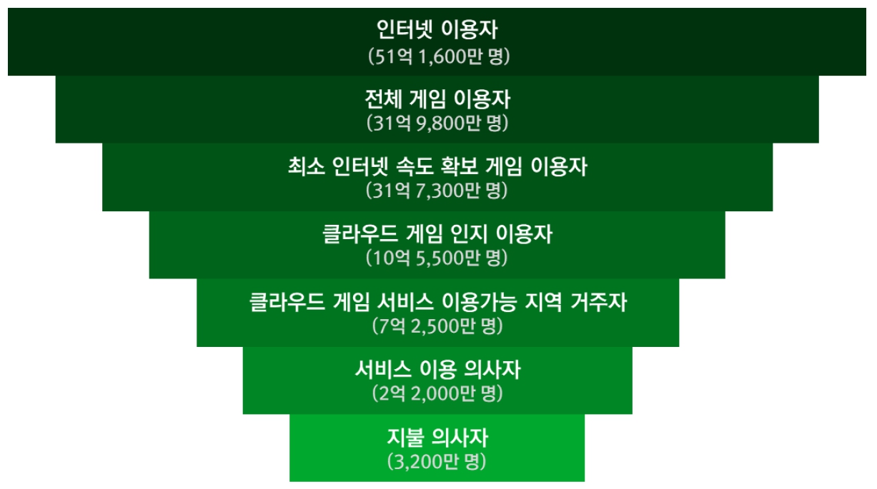 뉴주(Newzoo)가 발표한 클라우드 게임시장 퍼널은 전체 인터넷 이용자에서 클라우드 게임 서비스 지불 의사 이용자까지 이어지는 과정을 그린다. 전 세계 클라우드 게임 서비스를 이용할 의사가 있는 이용자 2억 2,000만 명 중 약 14.5%인 3,200만 명이 서비스에 지불할 의사가 있다고 발표했다.