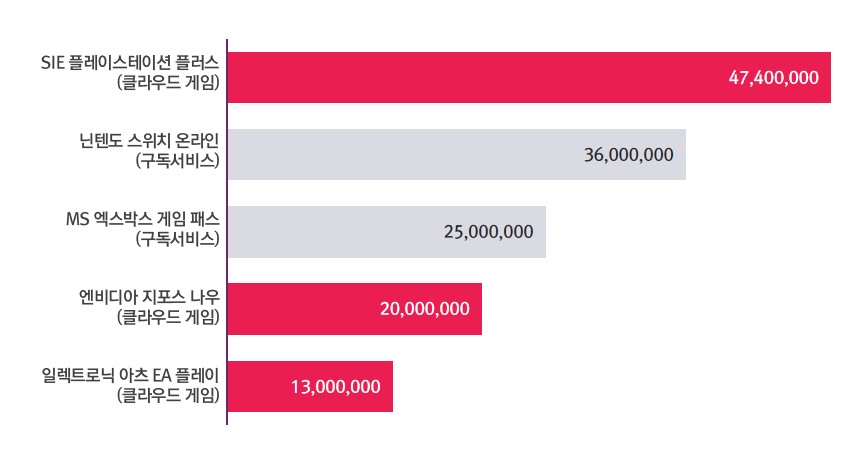 2023년 3월 주요 클라우드 게임 및 구독서비스 이용자 수 출처 : Coincrunch(2022.09), Vogue(2022.10)2023년 6월 소니(Sony) 그룹 요시다 켄이치로 회장은 "클라우드 게임 서비스에 여러 어려움이 있지만, 계속해서 도전할 것"이라고 밝혔다. 최근 SIE는 플레이스테이션5(PlayStation5) 공개 베타테스트를 진행하고 있는데, 테스트에 참여한 게이머는 4가지 해상도 옵션 중 하나를 골라 클라우드에 저장된 게임을 자동으로 불러와서 바로 플레이할 수 있는 것으로 알려졌다.