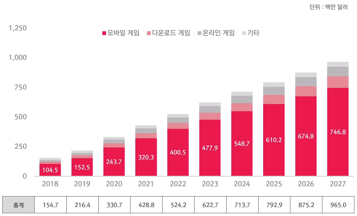 세계 7위의 인구를 자랑하는 방글라데시는 남아시아 권역의 대표 신흥 게임시장이다. 2018년에서 2027년까지 10년간 연평균 성장률은 22.6%로 예상되며 2027년 수익 규모도 9억 6,500만 달러(약 1조 3,510억 원)를 넘어설 것으로 보인다. 또한, 방글라데시 게임시장 내 모바일 게임 비중은 매년 약 6~70%를 기록하고 있어, 모바일 게임의 선호가 높은 것을 알 수 있다. 실제로 2018~2027년간 모바일 게임의 연평균 성장률은 24.4%로 방글라데시 게임시장 성장의 원동력이다.