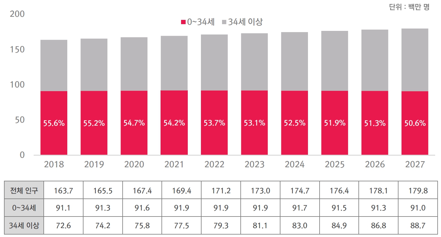 2018~2027년 방글라데시 연령별 인구 현황 출처 : 스태티스타(2023.08)