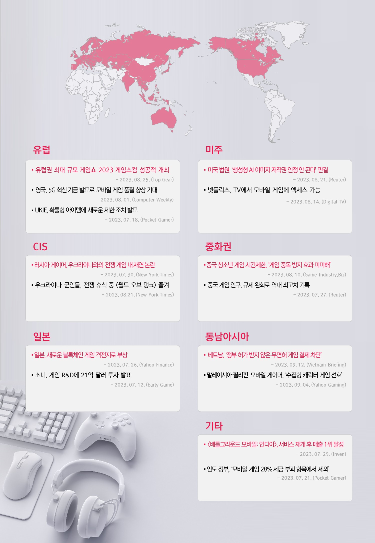 2023년 8월 23일부터 28일까지 독일 쾰른에서 열린 2023년 게임스컴(Gamescom)이 관람객 32만 명을 기록하며 막을 내렸다. E3 개최 취소의 여파로 53개국에서 1,227개 업체가 참가하고 온라인 중계 영상 조회수가 1억 8,000만 회를 기록하는 등 특히 많은 관심을 모았다. 올해 행사는 모바일보다 PC와 콘솔, 멀티 플랫폼 게임 부스가 인기를 끌고, 중국 모바일 게임 개발사 부스와 일본 서브컬처 장르 게임에 관람객이 몰린 점이 가장 큰 특징이다.