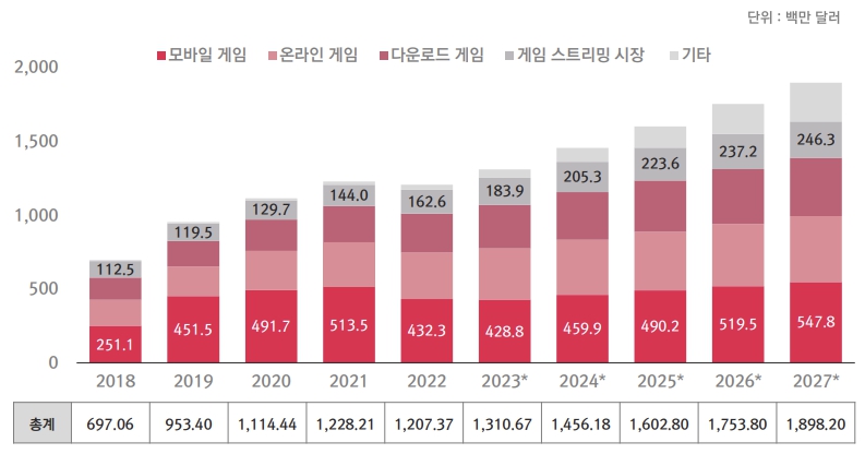 브라질은 전 세계가 주목하는 신흥시장인 남미에서도 높은 성장세가 예상되는 게임시장이다. 스태티스타(Statista)의 조사에 따르면 2018년에서 2027년까지 연평균 성장률은 11.8%로 예상되며, 2023년에는 13억 1,067만 달러(약 1조 7,694억 원)를 기록할 것으로 예상된다. 특히, 모바일 게임시장은 브라질 게임시장 중 가장 규모가 큰 분야로 2023년에는 4억 2,880만 달러(약 5,789억 원)로 추정되며 2018년부터 2027년까지 연평균 9.1% 성장할 것으로 기대된다. 또한, 게임 스트리밍 시장의 성장도 주목할 만하다. 2018년에는 1억 1,250만 달러(약 1,518억 원)에 불과했지만 2027년까지 2억 4,630만 달러(약 3,325억 원)까지 성장할 것으로 전망된다.