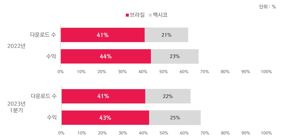 2016~2023년 브라질 게임 이용률 출처 : Pesquisa Game Brasil(2023)센서 타워(Sensor Tower)에 따르면 2022년 중남미 권역 모바일 게임 다운로드 수는 112억 건으로 전 세계 다운로드 수의 20%를 차지했으며, 인앱결제 수익도 13억 달러(약 1조 6,200억 원)를 기록했다. 이처럼 중남미 권역은 모바일 게임이 차지하는 비중이 큰 시장인데, 그중에서도 브라질은 권역 최대 모바일 게임시장으로 꼽힌다. 2022년 브라질 내 모바일 게임 다운로드 수는 45억 건, 인앱결제 수익 역시 5억 5,000만 달러(약 7,089억 원)를 기록하며 각각 권역 내 41%와 44%를 차지했다. 2023년 1분기에도 브라질은 중남미 내 모바일 게임 다운로드 건수 41%를 차지했으며, 인앱결제 수익 역시 43%가량이 브라질에서 발생한 것으로 조사되었다.