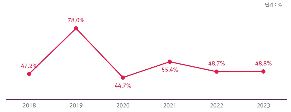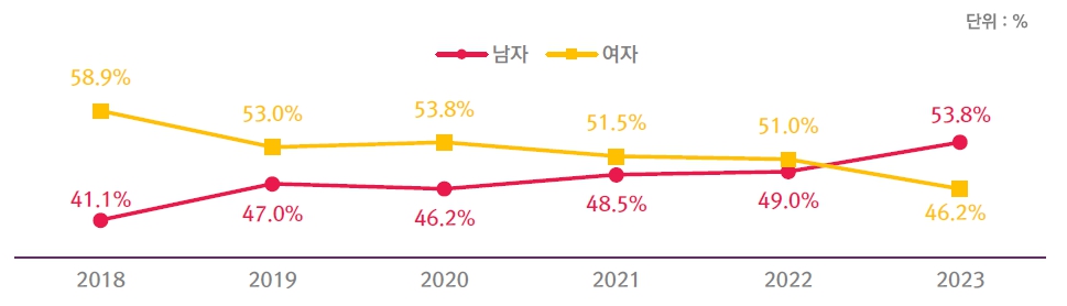 2022년 연간-2023년 1분기 권역 내 모바일 게임 다운로드 수 및 인앱결제 수익 비중 출처 : Sensor Tower(2023) 자료 재구성모바일 게임과 함께 브라질 게임시장에서 주목할 만한 것은 여성 게임 이용자 비중이 높다는 것이다. PGB에 따르면, 2018년 브라질 게임 이용자 중 58.9%가 여성이었으며, 이후 2022년까지 여성 이용자가 절반 이상을 차지한 것으로 조사되었다.