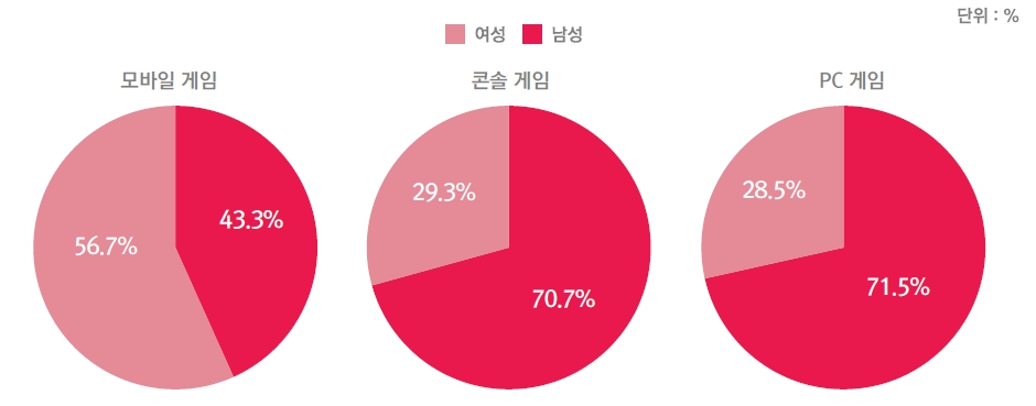 2018~2023년 브라질 게임 이용자 성별 비중 출처 : Pesquisa Game Brasil(2023)이처럼 브라질 내 여성 게임 이용자 비중이 높은 것은 스마트폰의 보급과 함께 퍼즐, 카드 등 비교적 쉽게 즐길 수 있는 모바일 게임이 다수 출시된 것이 영향을 준 것으로 보인다. 실제 브라질 내 플랫폼별 성별 분포를 살펴보면, 콘솔과 PC 게임의 여성 이용자 비율이 30% 이하인 데 비해 모바일 게임 이용자 비율은 56.7%로 과반수를 차지했다.