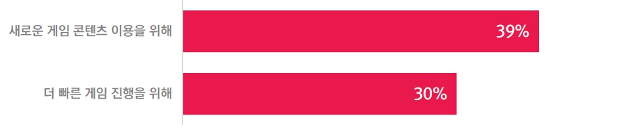 2023년 브라질 이용 플랫폼별 성별 분포 출처 : Pesquisa Game Brasil(2023)앞서 살펴본 바와 같이 브라질 내 인앱결제 비율은 상당히 높은 편이다. 뉴주(Newzoo)의 조사에 따르면 지난 6개월간 인앱 결제를 한 적이 있는 게임 이용자 비율은 전체 브라질 게임 이용자 중 43%로 나타났다. 그 중 39%가 새로운 게임 콘텐츠 오픈을 위해 인앱결제를 사용한다고 답했으며 빠른 게임 진행을 위해 결제를 한다고 응답한 비율도 30%에 달했다.