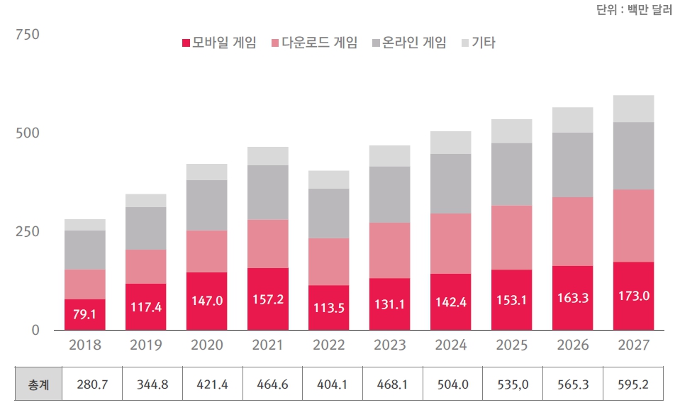 폴란드는 동유럽 최대의 게임시장이다. 2018년부터 2027년까지 10년간 연평균 성장률은 8.71%로 예상되며 2023년에는 4억 6,800만 달러(약 6,305억 원)를 넘어설 것으로 보인다. 또한, 폴란드 내 모바일 게임 시장의 성장이 두드러진다. 다운로드 게임 부문은 폴란드 내 가장 많은 이용자 수를 보였으나, 2024년 모바일 게임 부문이 594만 명의 이용자를 기록하며 1위로 성장했다. 이는 폴란드 내 인터넷망의 발달과 스마트 디바이스의 보급률 증가, e스포츠 인기 상승 등이 복합적으로 작용한 결과로 보인다.