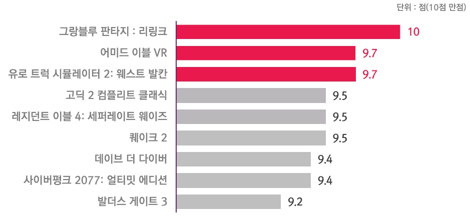 폴란드 유저 및 전문가들에게 가장 높은 평가를 받은 게임(2024년 2월) 출처 : GRY-Online S.A이외에도 중세 판타지 유럽을 구현한 RPG 게임인 <고딕 2: 컴플리트 클래식(Gothic II: Complete Classic)>, 광기를 띤 마을 주민들로부터 대통령의 딸을 구출하는 서바이벌 호러 <바이오하자드 RE:4(Resident Evil 4)>의 다른 등장인물 에이다(Ada Wong)의 시점을 다루는 <바이오하자드 RE:4 세퍼레이트 웨이즈(Resident Evil 4: Separate Ways)>, 마지막으로 넥슨 산하의 게임 개발사 민트로켓(Mintrocket)에서 개발한 해양 어드벤처 및 경영 시뮬레이션 게임 <데이브 더 다이버(Dave the Diver)>가 높은 평가를 받았다.