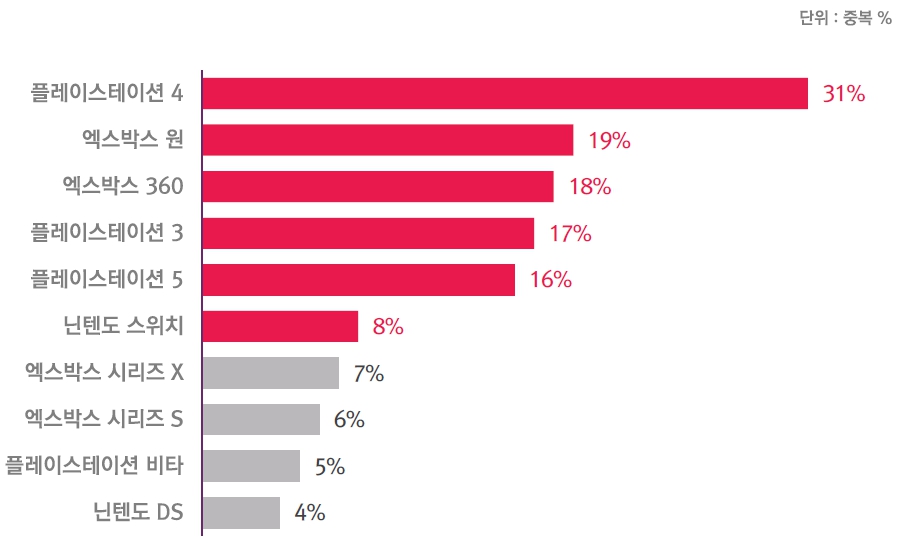 사이게임즈의 <그랑블루 판타지: 리링크> 출처 : Cygames2022년 3월, 436명의 15~64세 콘솔 게이머를 대상으로 실시한 설문조사 결과에 따르면 폴란드의 게이머들은 콘솔 중 소니(Sony)의 플레이스테이션(PlayStation) 4를 가장 많이 이용하고 있는 것으로 나타났다. <언차티드(Uncharted)>, <블러드본 (Bloodborne)> 등의 독점작을 지닌 플레이스테이션 4는 전체 응답자의 31%가 사용하는 콘솔로, 2위인 마이크로소프트(Microsoft)의 엑스박스 원(Xbox One)보다 12%p 더 높은 응답률을 보였다. 엑스박스 원은 <헤일로(HALO)>, <포르자 호라이즌(Forza Horizon)> 등의 독점작을 보유하고 있다. 2위부터 5위까지는 콘솔 간의 응답률의 차이가 크지 않았다. 각각 약 1%p의 차이로 엑스박스 360(Xbox 360)이 3위, 플레이스테이션 3은 4위, 플레이스테이션 5는 5위를 차지했다. 뒤를 이어, <젤다의 전설(The Legend of Zelda)>, <포켓몬(Pokémon)>, <모여봐요 동물의 숲> 등의 독점작을 지닌 닌텐도(Nintendo)의 닌텐도 스위치(Nintendo Switch)가 6위로 8%의 응답률을 보였다.