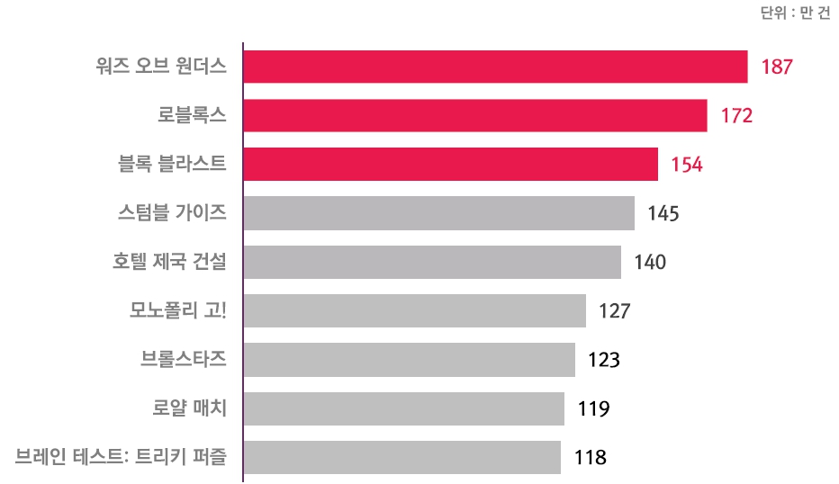 폴란드에서 이용률이 가장 높은 콘솔(2022년) 출처 : Polish Gamers2023년에 폴란드에서 가장 많이 다운로드 된 모바일 게임은 <워즈 오브 원더스(Words of Wonders)>로 나타났다. 워즈 오브 원더스는 모바일 십자말풀이 게임으로, 독특한 단서를 사용해 단어를 추리하는 방식으로 진행된다. 각국의 유명한 관광지를 주제로 한 다양한 난이도의 스테이지가 있으며, 약 187만 회 다운로드 되었다. 2위는 172만 회 다운로드 된 <로블록스(Roblox)>이며, 유저가 자신의 창작물을 제작하고 다른 유저의 창작물을 즐길 수 있는 메타버스 게임 플랫폼이다. 다운로드 수 154만 회로 3위를 차지한 <블록 블라스트(Block Blast)>는 제한된 공간에서 가능한 많은 블록을 제거하여 높은 점수를 얻는, <테트리스(Tetris)>와 유사한 퍼즐 게임이다. 또한 최대 32명의 플레이어가 장애물을 피하고 경쟁하는 <스텀블 가이즈(Stumble Guys)>와 자신만의 호텔을 경영하는 캐주얼 시뮬레이션 게임 <호텔 제국 건설(My Perfect Hotel)> 등 캐주얼 장르의 게임들도 높은 다운로드 수를 기록했다.