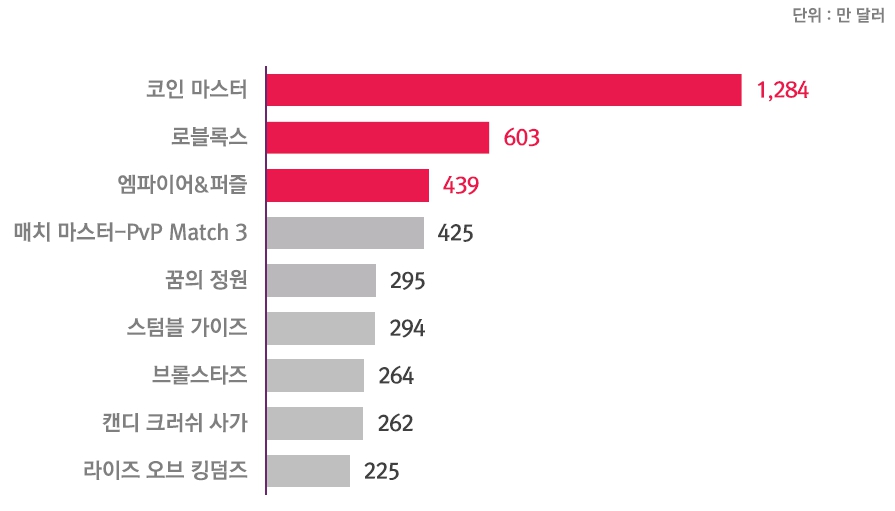 2023년 폴란드에서 가장 많이 다운로드 된 무료 모바일 게임 출처 : AppMagic2023년에 가장 높은 인앱결제 매출을 기록한 모바일 게임은 <코인 마스터(Coin Master)>로, 1,284만 달러(약 173억 원)를 달성해 2위인 <로블록스(Roblox)>의 603만 달러(약 81억 원)보다 두 배 이상의 격차를 보였다. <코인 마스터>는 각 플레이어가 자신의 마을을 발전시켜 다른 플레이어의 마을을 침략하고 자원을 획득하는 게임이다. 이 게임의 차별점은 모든 행위가 슬롯머신의 결과에 기반하여 이루어진다는 것이다. 플레이어는 행동을 취하기 위해 슬롯머신을 돌려야 하며, 슬롯머신을 더 자주 돌리기 위해서는 인앱결제가 필요하다. <로블록스>에서는 로벅스(Robux)라는 통화를 얻기 위한 결제가 발생하며, 이는 유료 게임 입장권, 아바타 치장 아이템, 게임 패스 등 게임 내 다양한 기능을 해금하는 데 사용된다. 439만 달러(약 59억 원)로 3위를 차지한 <엠파이어&퍼즐(Empires &Puzzles)>은 PvP 위주의 RPG 장르로, 퍼즐, PvE, 기지 건설 등 다양한 기능을 제공한다. 이외에도 경쟁 요소가 강한 캐주얼 및 퍼즐 장르의 게임들이 매출 상위권에 올랐다.
