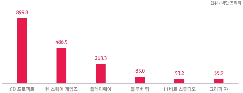 2023년 폴란드 모바일 게임 인앱결제 매출액 순위 출처 : AppMagic스태티스타에 따르면, 2023년에 폴란드 게임 개발사 중에서 가장 높은 매출액을 기록한 기업은 CD 프로젝트(CD Projekt)인 것으로 나타났다. CD 프로젝트의 매출액은 89억 9,800만 즈워티(약 2조 9,693억 원)로, 2위인 텐 스퀘어 게임즈(Ten Square Games)의 매출액 48억 6,500만 즈워티(약 1조 6,055억 원)의 약 1.85배에 달했다. CD 프로젝트는 <위쳐(The Witcher)>, <사이버펑크 2077(Cyberpunk 2077)> 등의 대표작을 가진 폴란드의 주요 개발 및 퍼블리싱 기업으로, 폴란드 게임 시장을 만들었다는 평가를 받는다. 2위인 텐 스퀘어 게임즈(Ten Square Games)는 모바일 게임에 특화된 개발사로 <피싱 클래시(Fishing Clash)>가 대표작이며 48억 6,500만 즈워티(약 1조 6,055억 원)의 매출액을 보였다.