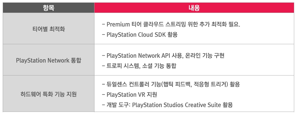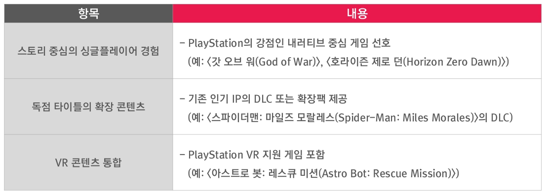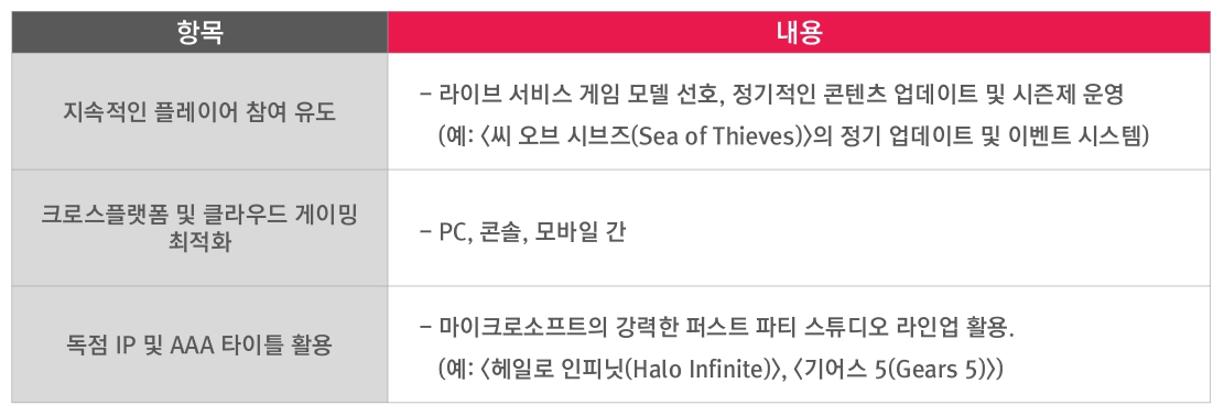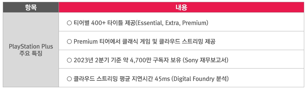 Xbox Game Pass(Microsoft) 주요 특징PlayStation Plus는 차별화된 티어 시스템을 도입하여 시장에 대응하고 있다. Premium 티어 게임 개발사에 더 높은 수익 비율을 제공함으로써 고품질 콘텐츠 확보에 주력하고 있다. 강력한 PlayStation 생태계는 개발사들에게 매력적인 플랫폼이지만, 단, 티어 시스템으로 인한 사용자 분산에 대한 고려가 필요하다.