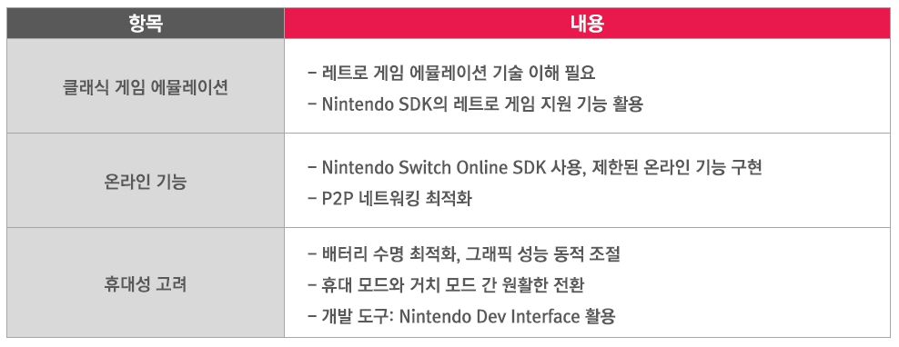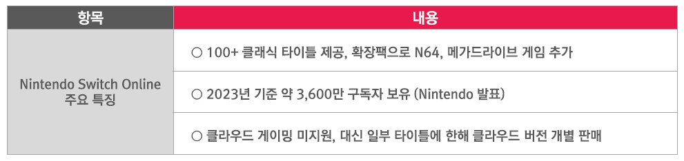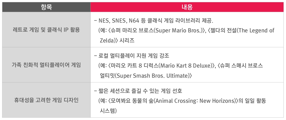 PlayStation Plus(Sony) 주요 특징Nintendo Switch Online은 클래식 게임 라이브러리를 중심으로 서비스를 구축하여 다른 구독형 서비스와 차별화를 꾀하고 있다. 레트로 게임 팬층을 타겟으로 하는 이 전략은 현대 게임에 대해서는 기존의 개별 판매 모델을 고수하는 이원화된 접근법을 보여준다. 이러한 방식은 개발사들에게 익숙한 수익 구조를 유지하면서도, 클래식 IP의 재평가와 레트로 스타일 신작 개발 등 새로운 시장 기회를 제공하고 있다.