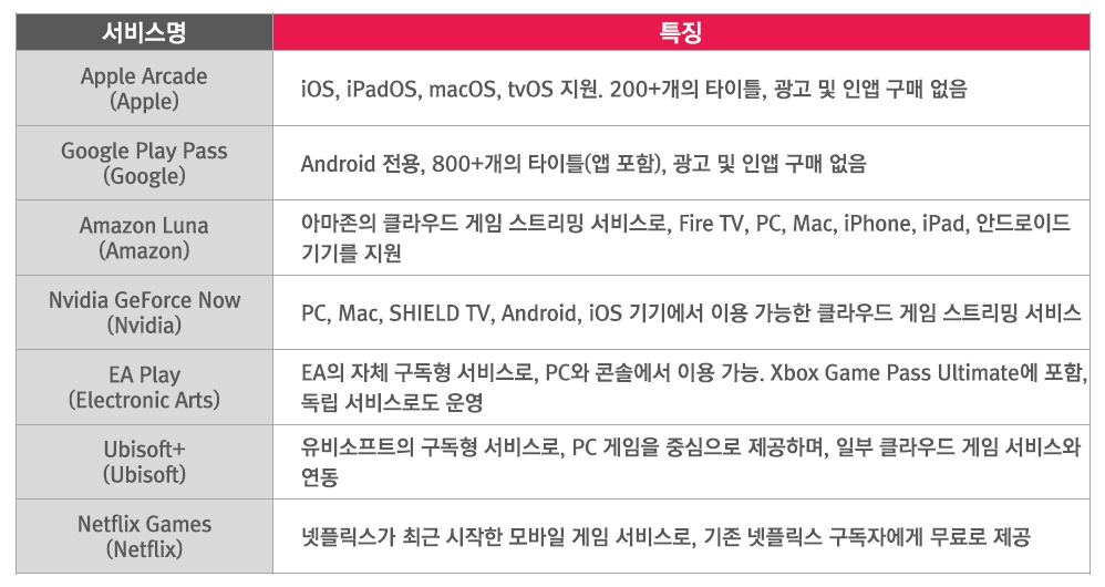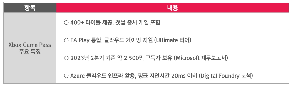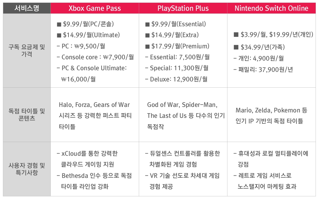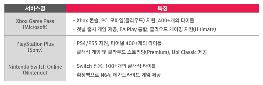 Xbox Game Pass(Microsoft) 게임 콘텐츠 특징 PlayStation Plus(Sony) 게임 콘텐츠 특징 Nintendo Switch Online(Nintendo) 게임 콘텐츠 특징구독형 디바이스 플랫폼은 안정적인 성장세를 보이고 있다. 클라우드 게임 스트리밍과 5G 기술의 발전은 초저지연과 초연결성을 바탕으로 구독 게임 서비스의 경제적 지속 가능성에 기여한다. 이를 통해 고사양 게임을 다양한 디바이스에서 즉시 플레이할 수 있게 되었다.