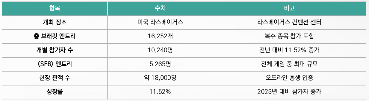 격투게임 이스포츠의 성장세는 EVO(Evolution Championship Series) 대회 참가자 수에서도 확인된다. EVO는 격투게임 커뮤니티가 주도하는 세계 최대 오프라인 토너먼트로, 2024년 미국 라스베이거스에서 열린 대회에서 총 16,252개의 브래킷 엔트리가 접수되었고, 10,240명의 개별 선수가 참가했다. 특히 <SF6> 엔트리는 5,265명으로 전체 게임 중 가장 큰 규모를 기록했다. 이 대회는 참가자 수가 2023년 대비 11.52% 증가해 격투게임 이스포츠의 성장성을 증명했다. 또한 EVO 2024에서는 약 18,000명의 관객이 방문해 오프라인 이벤트로서의 흥행력도 입증했다. 2025년 EVO 역시 라스베이거스 컨벤션 센터 서관에서 18,000명의 관중을 모았다고 보도되며, EWC 2025의 모멘텀을 준비하는 역할을 수행했다.