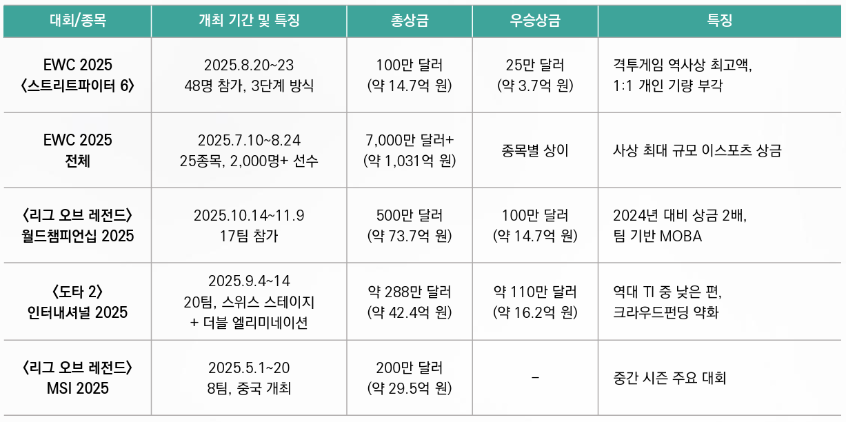 주요 대회 상금을 비교하면, EWC 2025 <SF6> 종목의 총상금은 <리그 오브 레전드> 월드챔피언십 2025의 총상금 500만 달러(약 73.7억 원)(우승 100만 달러(약 14.7억 원))에 비해 규모가 작다. 그러나 단일 격투게임 기준으로는 역사상 최고 수준이다. 한편 <도타 2>의 인터내셔널 2025(TI14)는 총상금이 약 288만 달러(약 42.4억 원)로, 2013~2019년에 2천만 달러(약 295억 원) 이상을 모았던 것에 비해 크게 감소했다. 이는 크라우드펀딩 모델이 약화된 영향으로 분석되며, EWC의 안정적인 상금 구조가 주목받는 이유다. 라이엇게임즈(Riot Games)는 2024년 대비 <리그 오브 레전드> 월드챔피언십 상금을 두 배로 늘려 지속가능한 생태계를 목표로 하고 있어, 격투게임 역시 상금 확대를 통한 선수 수익성과 팬 관심 유지 전략이 필요하다.