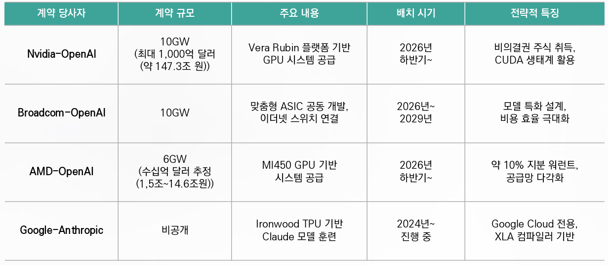 Nvidia-OpenAI 10GW(최대 약 147.3조 원), Broadcom-OpenAI 맞춤형 ASIC 10GW 등 대규모 계약 체결