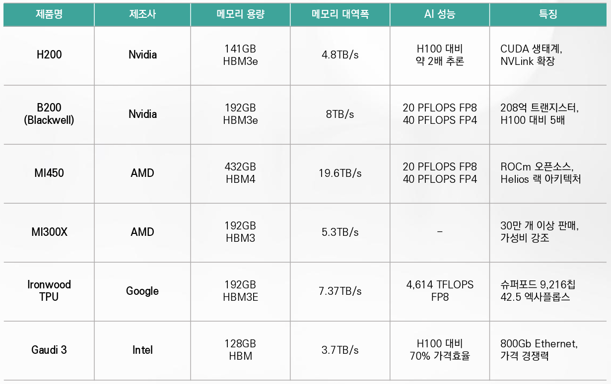 <표> 주요 AI 칩 제품 사양 비교