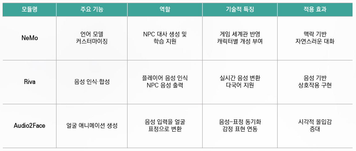 <표> Nvidia ACE 플랫폼 구성 모듈 및 기능