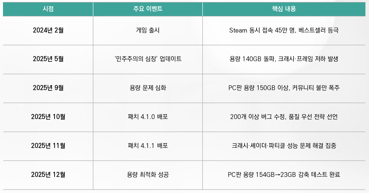 <표> <헬다이버즈 2> 품질 위기 타임라인