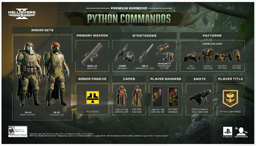 - GamesRadar+, "Helldivers 2 Python Commandos release time and rewards", 2025.11.25, https://www.gamesradar.com/games/third-person-shooter/helldivers-2-python-commandos-warbond/