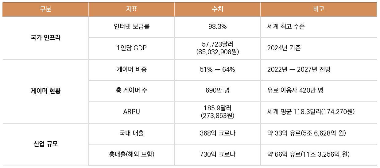 <표> 스웨덴 게임 시장 주요 지표 요약