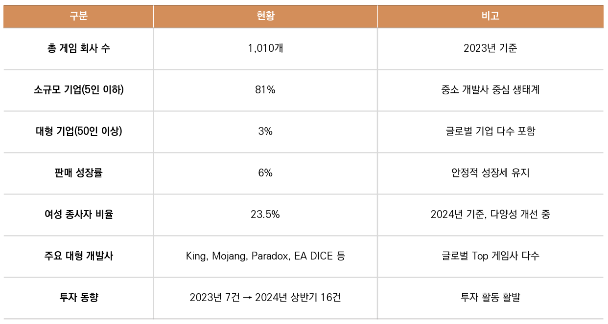 스웨덴 게임산업은 수십 년간 지속적인 성장을 이어왔다. 2023년 기준 스웨덴에는 1,010개의 게임 회사가 존재하며, 그 중 81%는 직원 5인 이하의 소규모 기업이고 3%만이 50인 이상을 고용하고 있다. 이는 중소 개발사가 대형사와 함께 상생하는 건강한 생태계가 형성되어 있음을 보여준다. 판매 성장률은 6%로 안정적이며, 2024년 여성 종사자 비율은 23.5%로 다양성도 개선되고 있다. 스웨덴 경제 구조는 높은 기술력을 기반으로 소프트웨어 및 IT 산업이 발달했고, 게임산업에서도 이러한 강점이 발휘되고 있다.