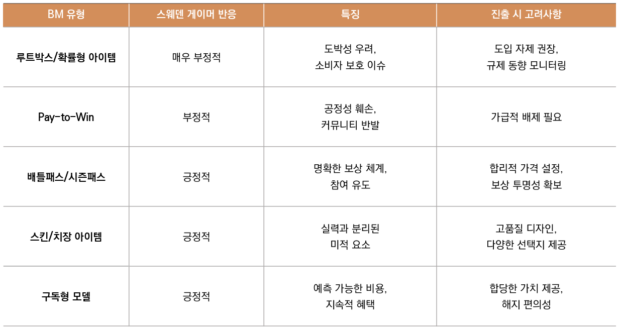 스웨덴 게이머는 공정함과 투명성을 중시하며, Pay-to-Win(P2W) 모델에 극도의 반감을 가지고 있다. 한 연구에서 스웨덴 게이머는 마이크로트랜잭션에 대해 심리적 장벽을 느끼며, 구매 결정에는 커뮤니티 규범과 동료 압력이 큰 영향을 미친다고 분석했다. 특히 루트박스와 확률형 아이템에 대한 부정적인 인식이 강하다. 반면 배틀패스, 시즌패스, 구독형 모델, 스킨 중심의 치장 아이템은 긍정적으로 받아들여진다. 이는 유럽·북미 시장 전반의 트렌드와 일치하며, 스웨덴 시장 진출 시 BM 설계의 핵심 고려사항이다.
