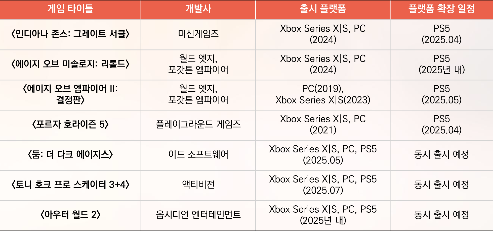 Xbox의 멀티플랫폼 전략은 2025년을 기점으로 본격화되고 있다. 위 표에서 볼 수 있듯이, 과거 Xbox와 PC에만 출시되던 주요 독점 타이틀들이 PS5로 확장되고 있으며, 일부 신작은 출시 시점부터 멀티플랫폼으로 계획되어 있다. 특히 주목할 점은 플랫폼 확장 예정과 동시 출시 예정의 차이다. <인디아나 존스: 그레이트 서클>과 같은 플랫폼 확장 예정인 게임들은 Xbox와 PC에 먼저 출시된 후 PS5로 확장되는 경우인 반면, <둠: 더 다크 에이지스>와 같은 동시 출시 예정 게임들은 처음부터 모든 플랫폼에 동시에 출시되는 신작들이다.