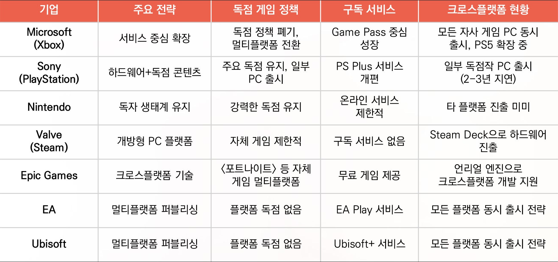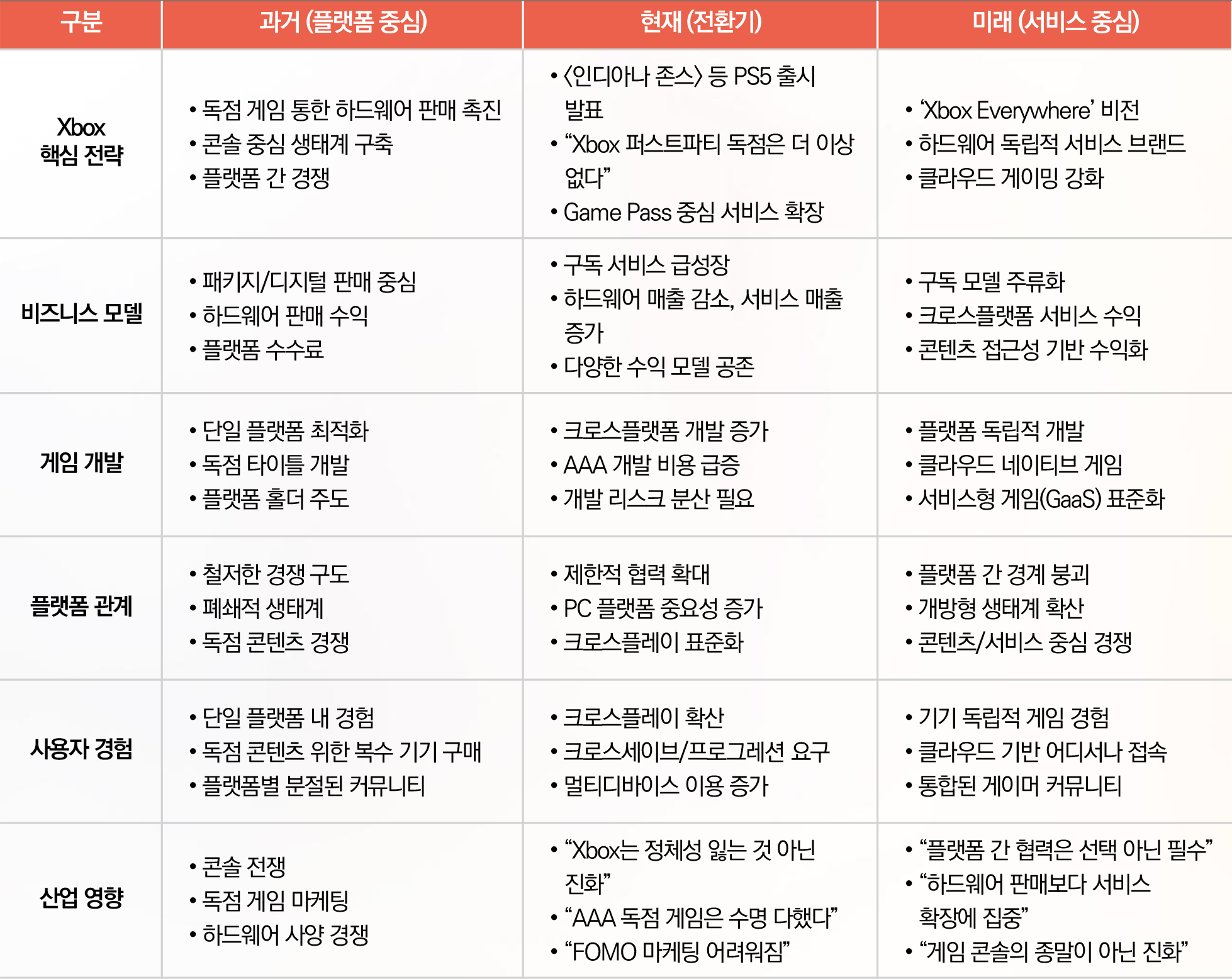 - 플랫폼 기업의 역할 재정립 (하드웨어 제조사 → 게임 서비스 제공자)