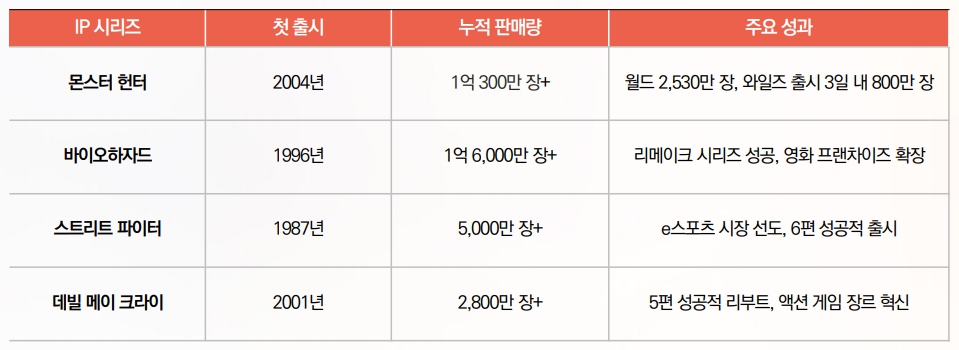 <표> 캡콤의 주요 IP별 누적 판매량 및 주요 성과