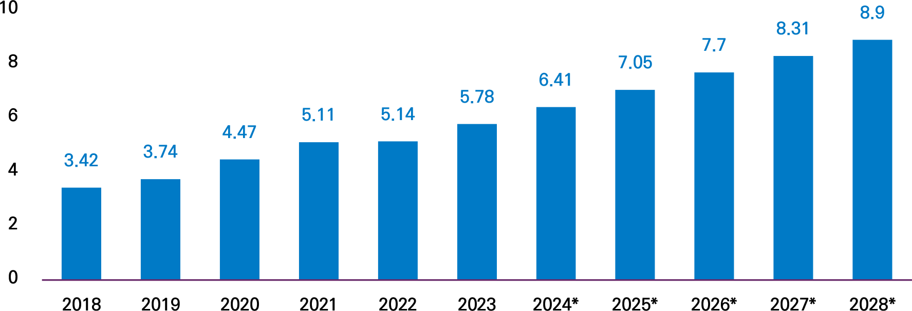 <그림> 브라질 게임시장 규모(2019-2028) 단위: 십억달러