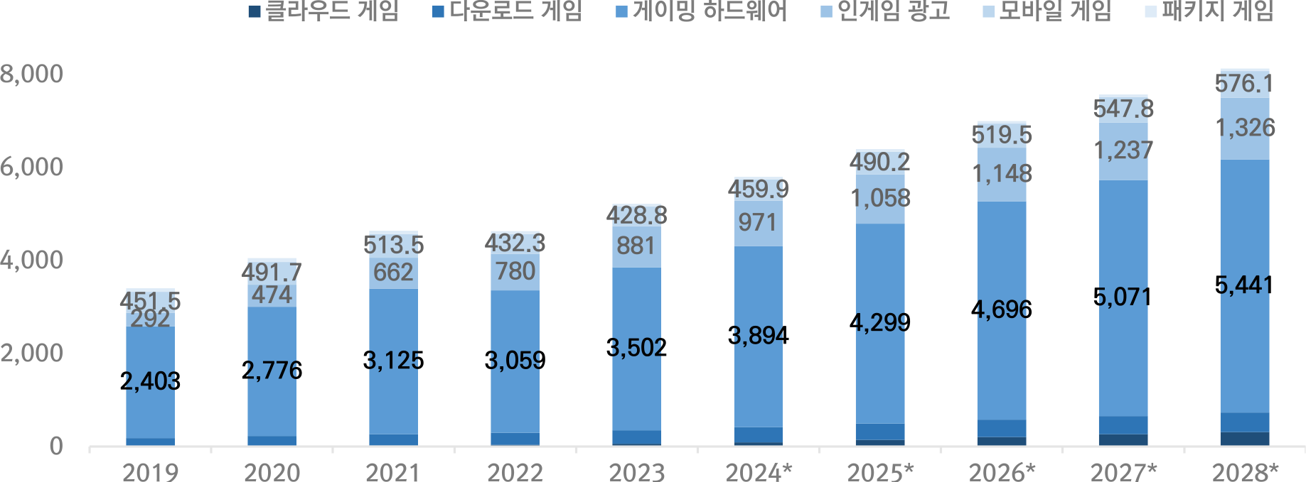 <그림> 브라질 게임시장 세그먼트별 규모(2019-2028) 단위: 백만 달러