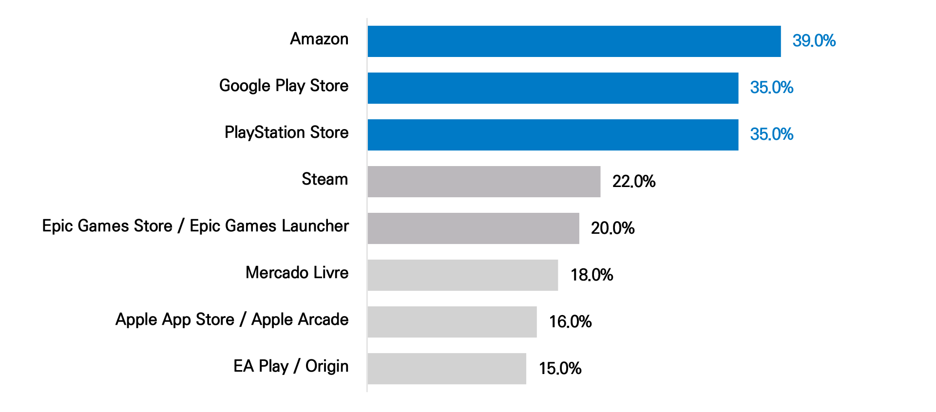 게임 구매 채널 측면에서는 아마존(39%), 구글 플레이 스토어(35%), 플레이스테이션 스토어(35%)가 가장 인기 있는 플랫폼으로 나타났다. 스팀(22%), 에픽 게임즈 스토어(20%), 메르카도 리브레(18%)가 그 뒤를 이었다. 주목할 점은 2023년 디지털 게임 구매 플랫폼 순위에서는 구글 플레이 스토어와 플레이스테이션 스토어가 각각 39%로 공동 1위였던 반면, 2024년에는 아마존이 1위로 올라섰다는 것이다. 이는 아마존의 브라질 시장 진출 강화와 프라임 게이밍 혜택 확대가 효과를 거두고 있음을 보여준다.