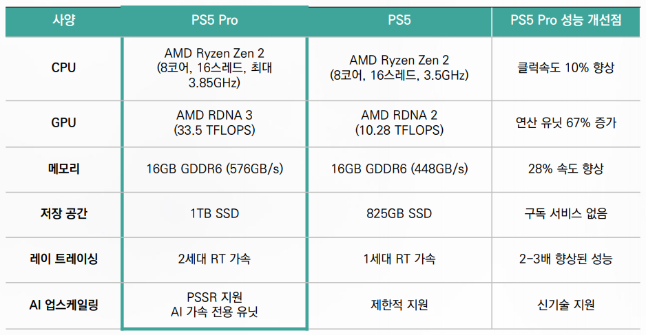 <표> PS5 Pro와 기존 PS5 사양 및 성능 비교