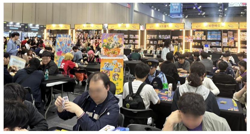 조금 더 안쪽으로 들어가자 보드게임존이 마련돼 있었다. 이 공간은 다른 부스와 달리 소음이 적고, 의자가 배치된 채로 운영되어 가족 단위 관람객이나 친구들과 함께 찾은 유저들이 장시간 머무르기에 적합했다. 실제로 부모와 아이가 함께 앉아 게임을 설명받으며 플레이하는 모습, 외국인 관람객이 현장 스태프의 도움을 받아 룰을 이해하는 모습 등이 차분한 분위기 속에서 펼쳐지고 있었다.